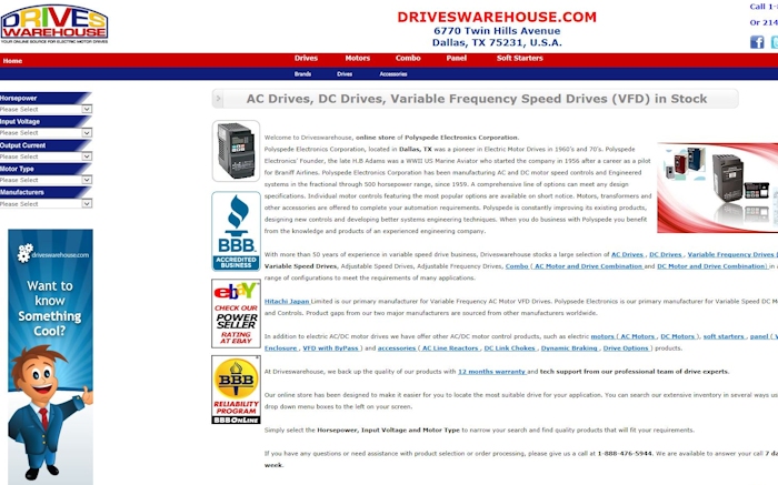 Driveswarehouse aims to be the most comprehensive online store for all of your industrial drive needs. Driveswarehouse also stocks a wide variety of AC Drives, DC Drives ,AC Motors, Combo, Panels, Starters and Accessories. All products from Driveswarehouse are backed up 12 months warranty and tech. Supported by a company that has been in drive business over 50 years.